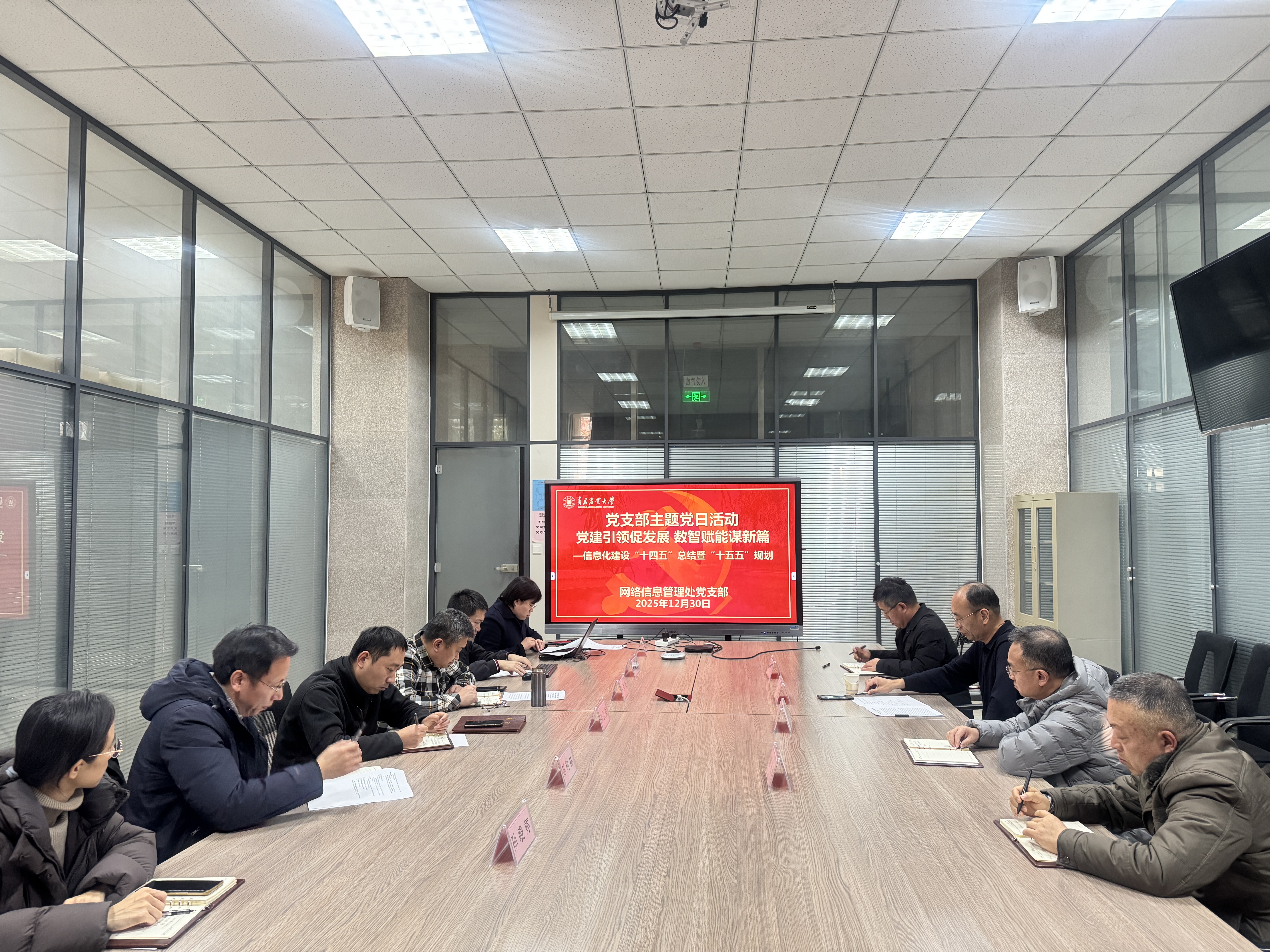 为深入贯彻落实党中央、国务院关于数字中国、教育强国的重要指示精神,积极响应国家教育数字化战略行动部署,12月30日下午,网络信息管理处党支部开展了“党建引领促发展 数智赋能谋新篇—信息化建设‘十四五’规划总结暨‘十五五’规划谋划”主题党日活动。活动由牟肖光主持,副校长孟晓军列席,全体党员干部参加。