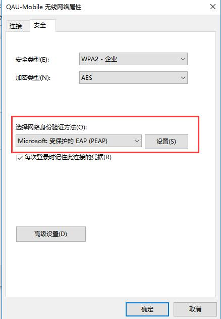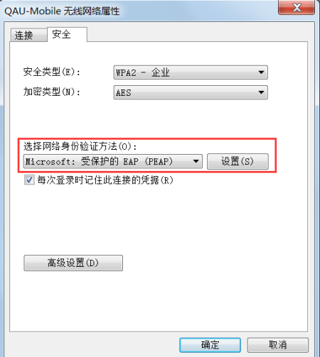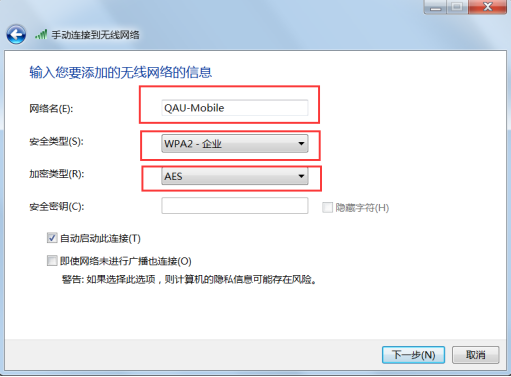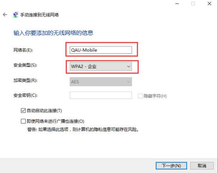 (4)输入无线网络名“qau-mobile”,安全类型选择“wpa2-企业”,加密类型选择“aes”。