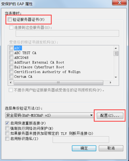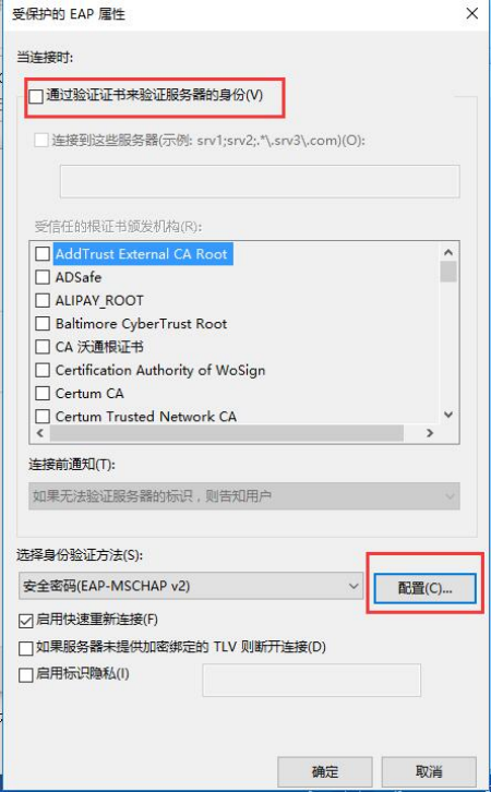 (7)取消“验证服务器证书”,并且点选“配置”