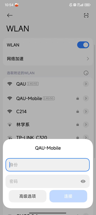 (1)打开无线终端的无线功能,搜索ssid名为“qau-mobile”的无线网络,接入网络。