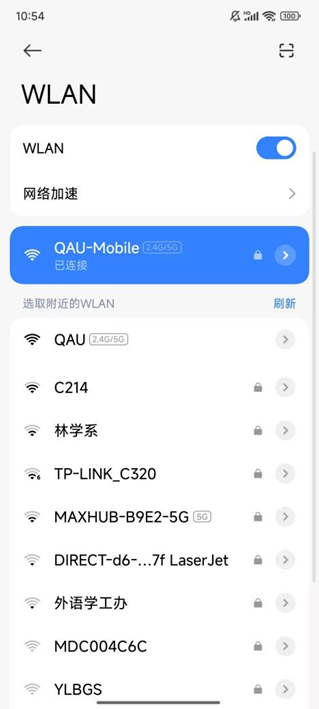 (1)打开无线终端的无线功能,搜索ssid名为“qau”或“qau-auto”的无线网络,接入网络。