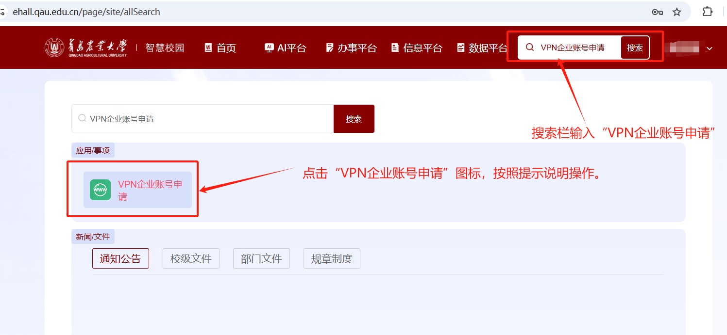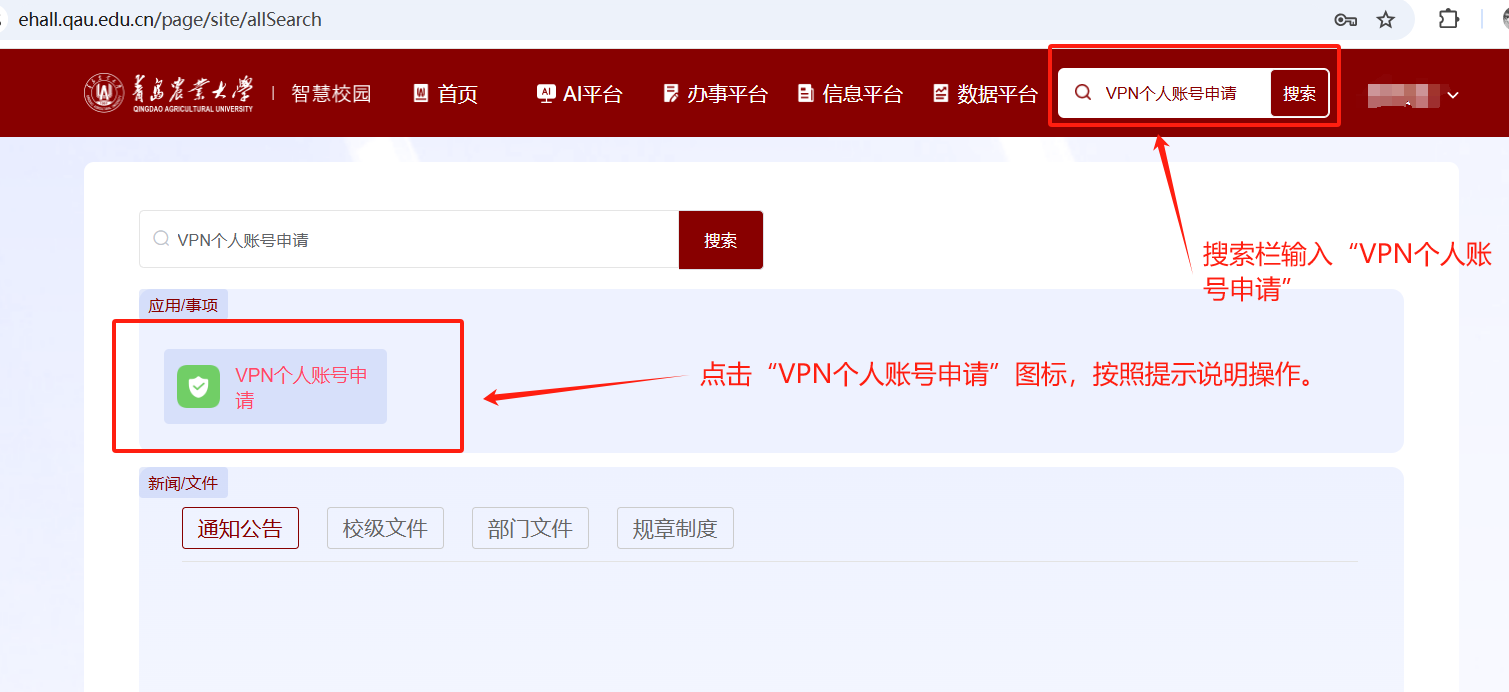 (2)进入青岛农业大学智慧校园门户后,在右上方搜索栏里输入“vpn个人账号申请”,选择点击“vpn个人账号申请”图标,按照提示说明操作。