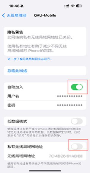 (2)账号密码为统一身份认证的账号和密码,选择信任及自动加入关闭私有无线局域网地址。
